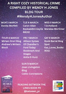 From time to time, I run a 6Ws feature to give fellow authors and their books a bit of promotion. Wendy H Jones is next. (With a nod to my former life as a journalist, I opted for the 6Ws of the business: who, what, when, where, why and how, which counts as it ends in W.) I will let her tell you about the anthology of short stories this UK author has organized, A Right Cozy Historical Crime — the third in a series. In the mood for a mystery set in the past but don’t have time for a full-length book? Then dig into one of the short stories in this anthology. Among the titles are: A Monster in the Village, The Disappearance of Miss Eliza Hawkins, and Dead on Midnight. By the way, this post is part of the Reading Between the Lines Vlog Tour. Here, I will let Wendy take over.